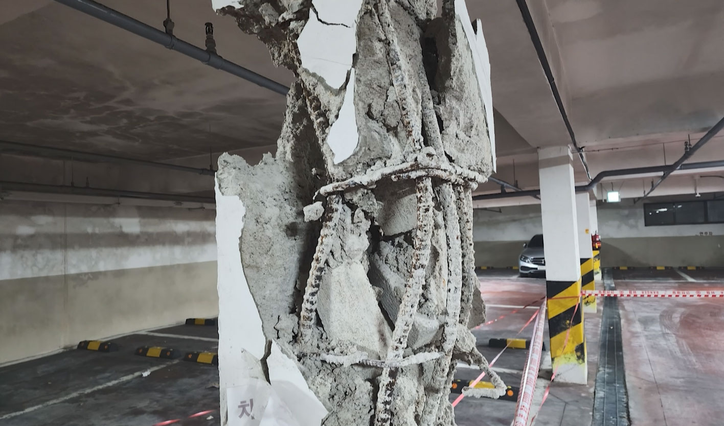 고양시 일산 서구 주엽동 문촌마을 2단지 라이프 아파트 지하주차장의 기둥이 붕괴되어 기둥 안에 있는 철근도 휘어져버렸습니다.