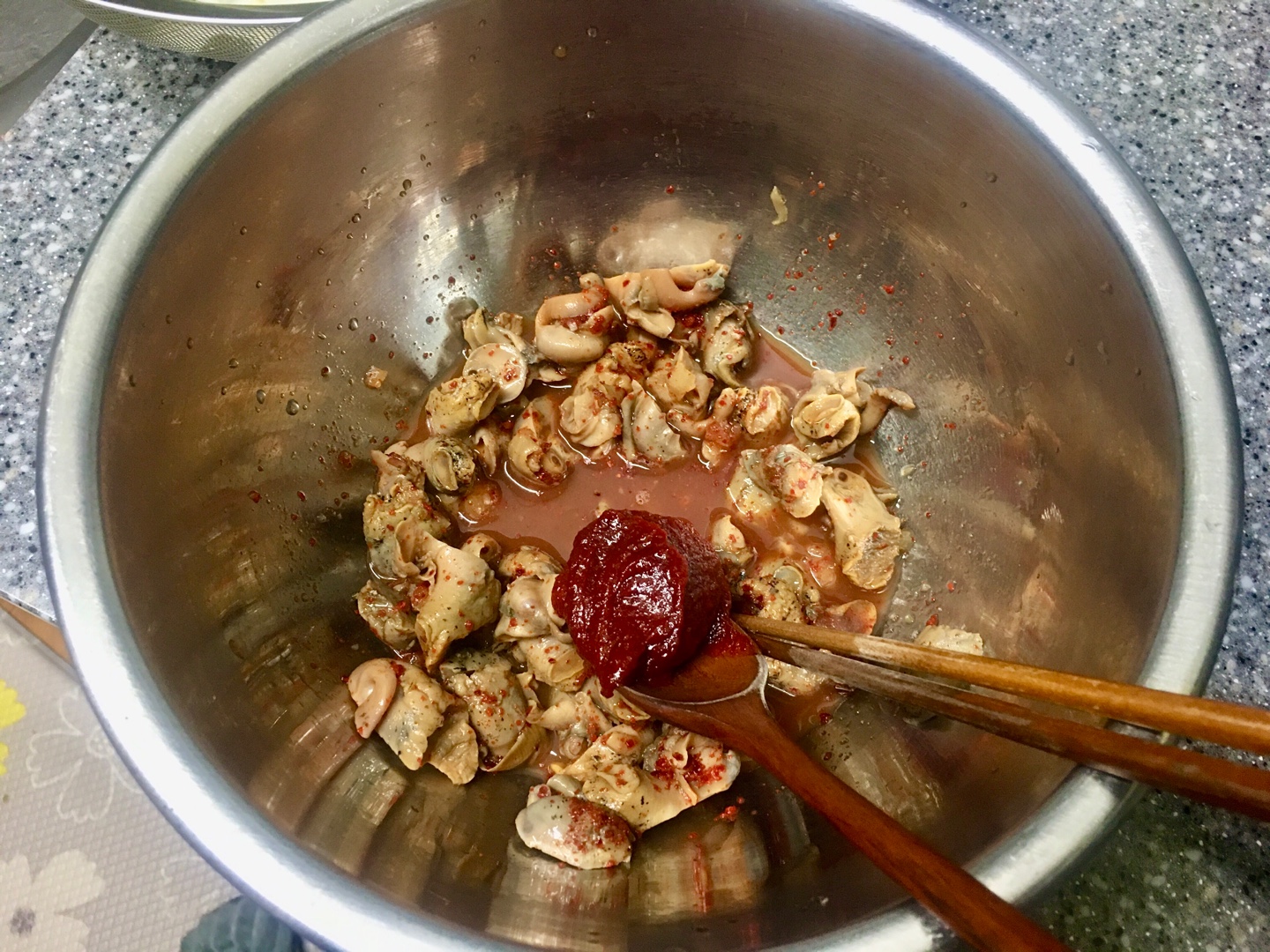 아 식초를 넣어야죠 그래야 새콤하니까요!! 그렇게 1차로 골뱅이만 잘 버무리고 그다음에 채에 받쳐 놓았던 양파와 상추를 넣고 함께 잘 양념이 배도록 버무립니다.