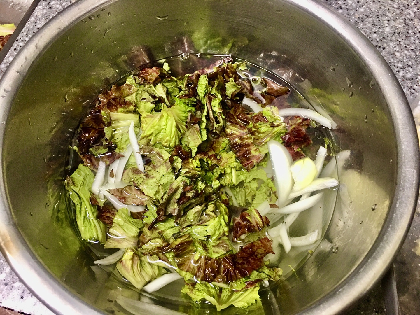우선 양파 반 개를 얇게 채 썰어 손질하고, 찬물에 퐁당, 그리고 상추 크기가 작아서 약 10 잎정도를 손질해서 겉절이 하듯이 잘라 양파와 함께 찬물에 넣어 줍니다.