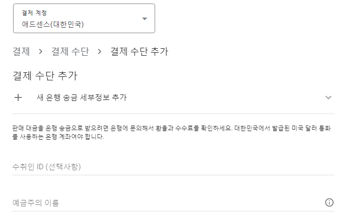 지급 계좌는 인터넷에서 검색해보면 외환 계좌를 만들지 않아도 수익이 발생해서 구글에서 입금 처리를 하면 자동으로 한화로 환전돼서 입금이 된다는 글도 본 적이 있기는 한데, 저는 다른 대부분의 분들이 안내를 해주셨던 것처럼 외환 계좌를 등록하는 것을 결정하였습니다.