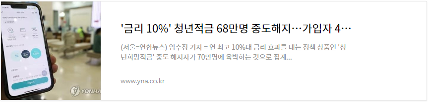 년 최고 금리 10% 효과를 내는 정책 상품 '청년희망적금' 중도 해지자가 68만 명을 넘어서고 있다고 합니다.
