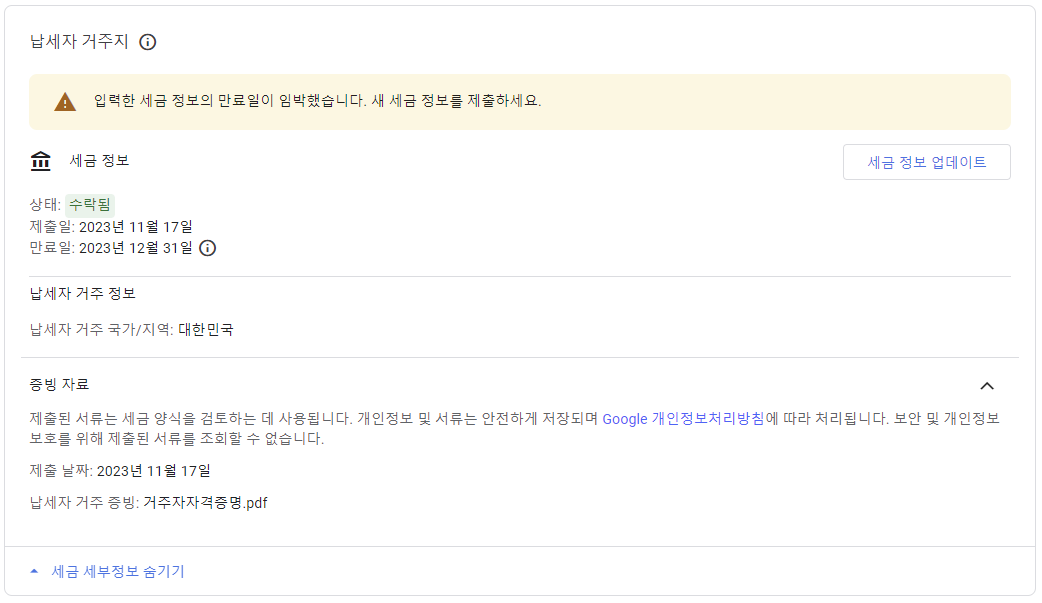 저처럼 세금정보 업데이트, 그러니까 만료일 관련해서 지속 적으로 메시지가 표시되시는 분은 거주자 자격 증명을 제출하셨다면 그냥 기다리는 방법으로 대응을 해야 할 것 같습니다.