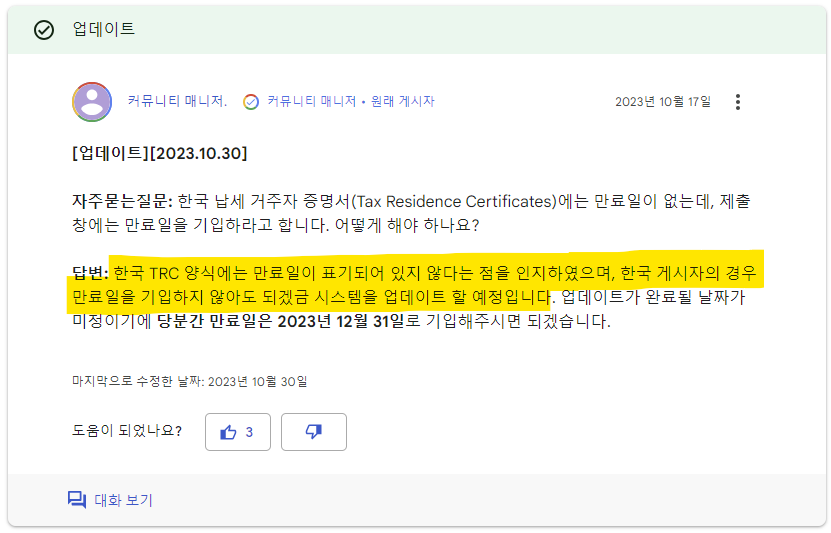 위 이미지를 보시면 '세금 거주 정보 수집'이라는 공지사항이 있고요 들어가서 보면 대한민국 만료일에 대한 Google의 예상 대응도 커뮤니티 매니저가 답변을 해 놓았습니다.