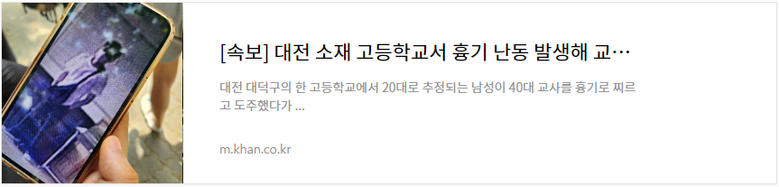 서현역 칼부림 사건이 3일 어제 일어났는데, 이번에는 대전 대덕구의 한 고등학교에서 20대로 추정되는 남성이 학교에 무단 침입하여 40대 교사를 흉기로 찌르고 도주했다가 2시간 만에 경찰에 붙잡혔다고 합니다.