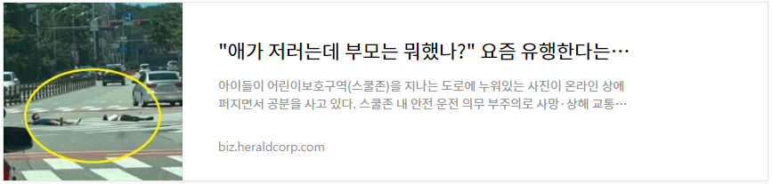 민식이법 놀이라고 아세요? 미쳐도 도대처 얼마나 미쳐있는 것인지, 애꿎은 피해자 만들고 트라우마 만들어서 사람 힘들게 하는 것이 이 아이들이 하는 놀이인가 싶습니다.