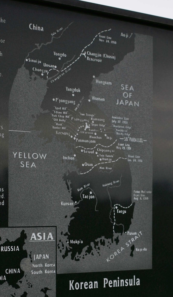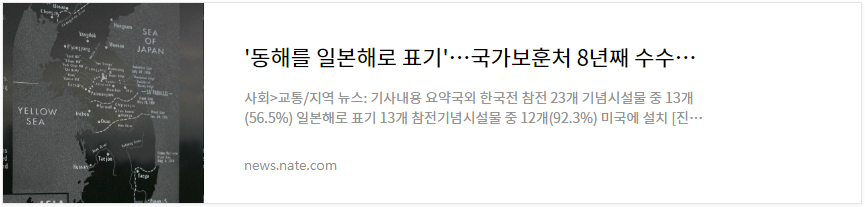 대한민국을 제외한 국외의 한국전 참전 23개 기념 시설 중에 13개(56.5%)의 시설물에 동해를 일본해로 표기하였으며 13개의 시설물 중에서 12개는 미국에 설치되어 있다고 합니다.