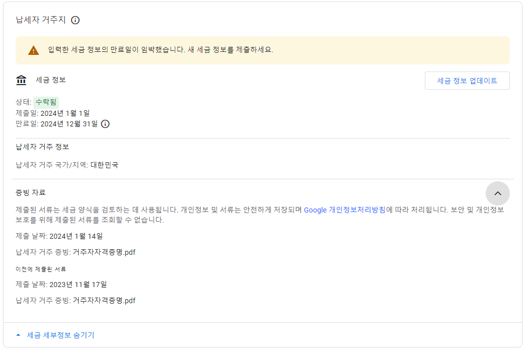 납세자 거주 국가에 대해 제공한 세금 정보가 곧 만료될 예정입니다. 새 양식을 제출해 주세요