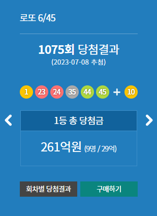 8일 로또 복권 1075회 1등 당첨번호가 1,23,24,35,44,45 (10)으로 발표되었습니다.