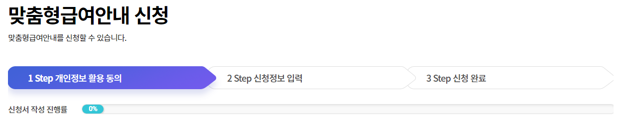 그렇게 다시 들어오면 맞춤급여안내 신청 페이지로 들어올 수 있고 화면 상단에 신청 단계에 맞게 진행상태를 확인할 수 있게 구성이 되어 있어 신청함에 있어서 어려움이 없게 되어 있습니다.