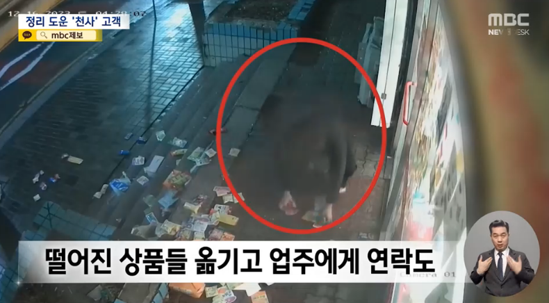 그는 가게 밖에 흩어져 있는 상품을 보고, 고민하는 듯 보이더니 가게 안으로 들어가 상황을 살피고 다시 나와서 가게 밖에 떨어져 있는 상품들을 말없이 주워서 가게 안으로 옮겨놓았습니다.