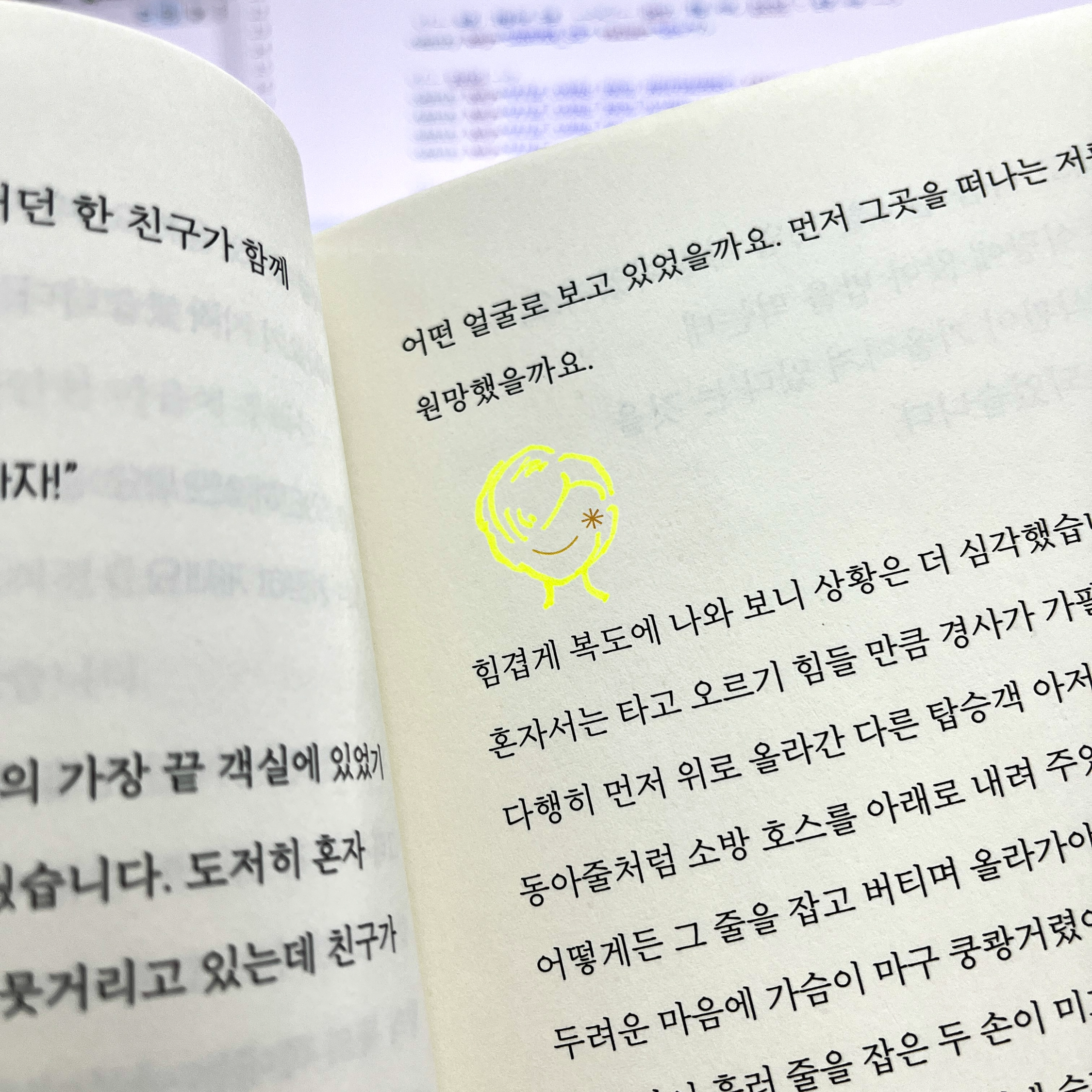 책 마디마디마다 그려진 작은 이모티콘 어떻게 보면 별이 하늘로 올라가는 것처럼 보이기도 하고, 뭔가 의미하는 것이 있지 않을까 생각이 되었던 순간 다음에 다시 나온 이 이모티콘에 얼굴을 그려 넣었습니다.