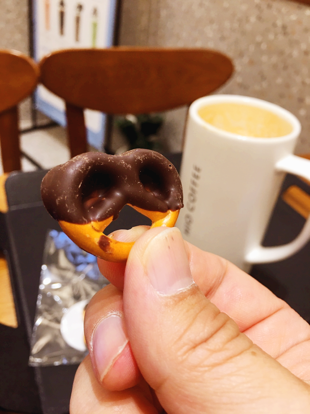 그 작은 브레텔에 초코를 찍어 만든 그래서 단짠과 고소함이 같이 있는 아주 기가 막힌 간식이네요 ^^