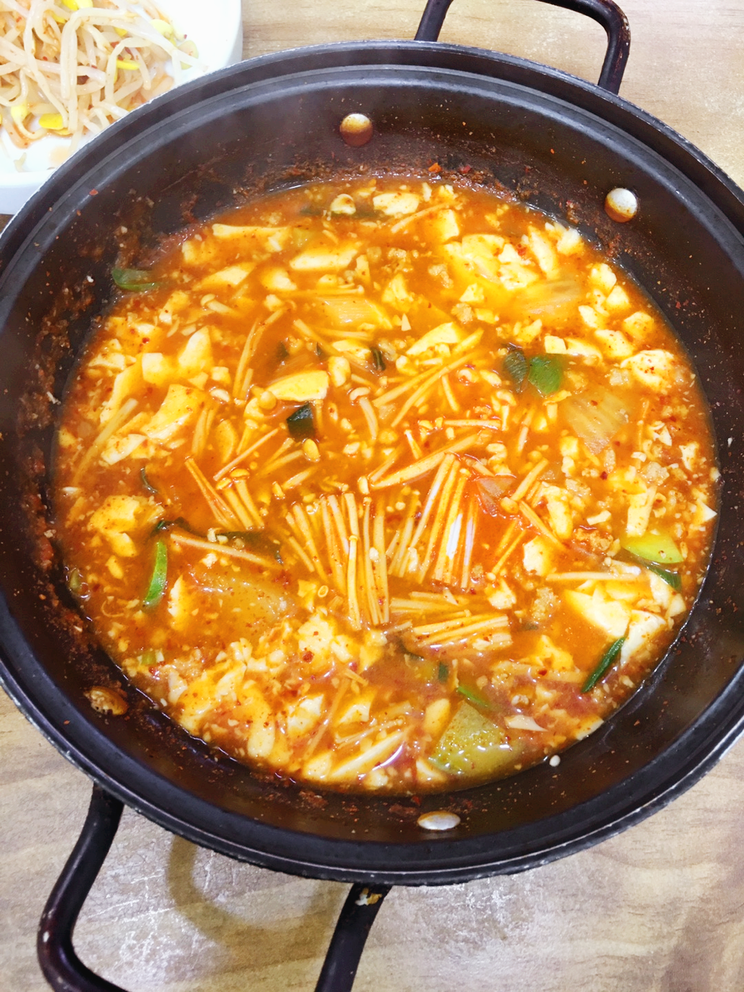 순두부찌개는 달걀 없이 팽이와 호박이 들어있었고 향과 맛은 역시 MSG의 향이 진하게 나는 전형적인 순두부 찌개였는데 국물을 한 숟가락 떠먹어보니!, '음 이거 완전 MSG는 아닌 것 같은데?' 하는 느낌이 나더라고요, 궁금했습니다.