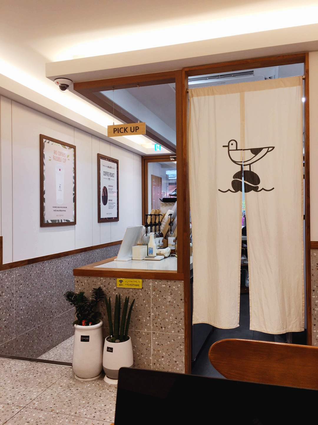 문 밖에서 안쪽을 바라보니 시장에 있는 카페라고 하기에는 밝고 따뜻한 느낌의 조명이 눈에 띄고 테이블이 보여 들어가면서 '저기 안에서 마셔도 되죠?' 이렇게 물어보고 앉았습니다.