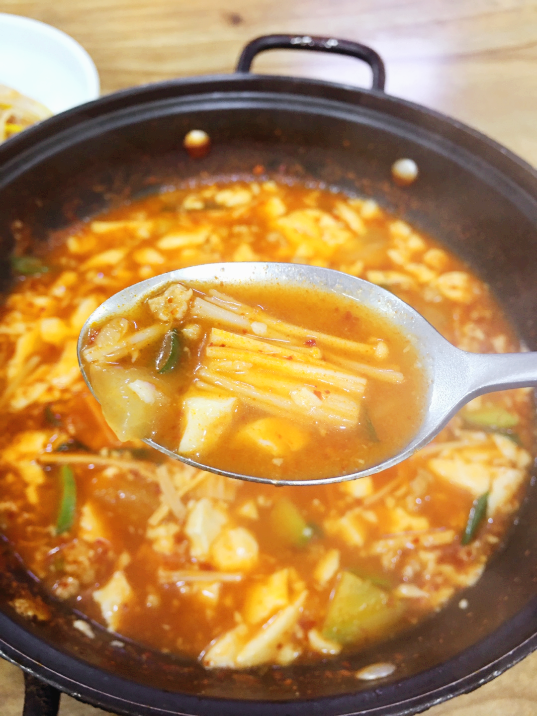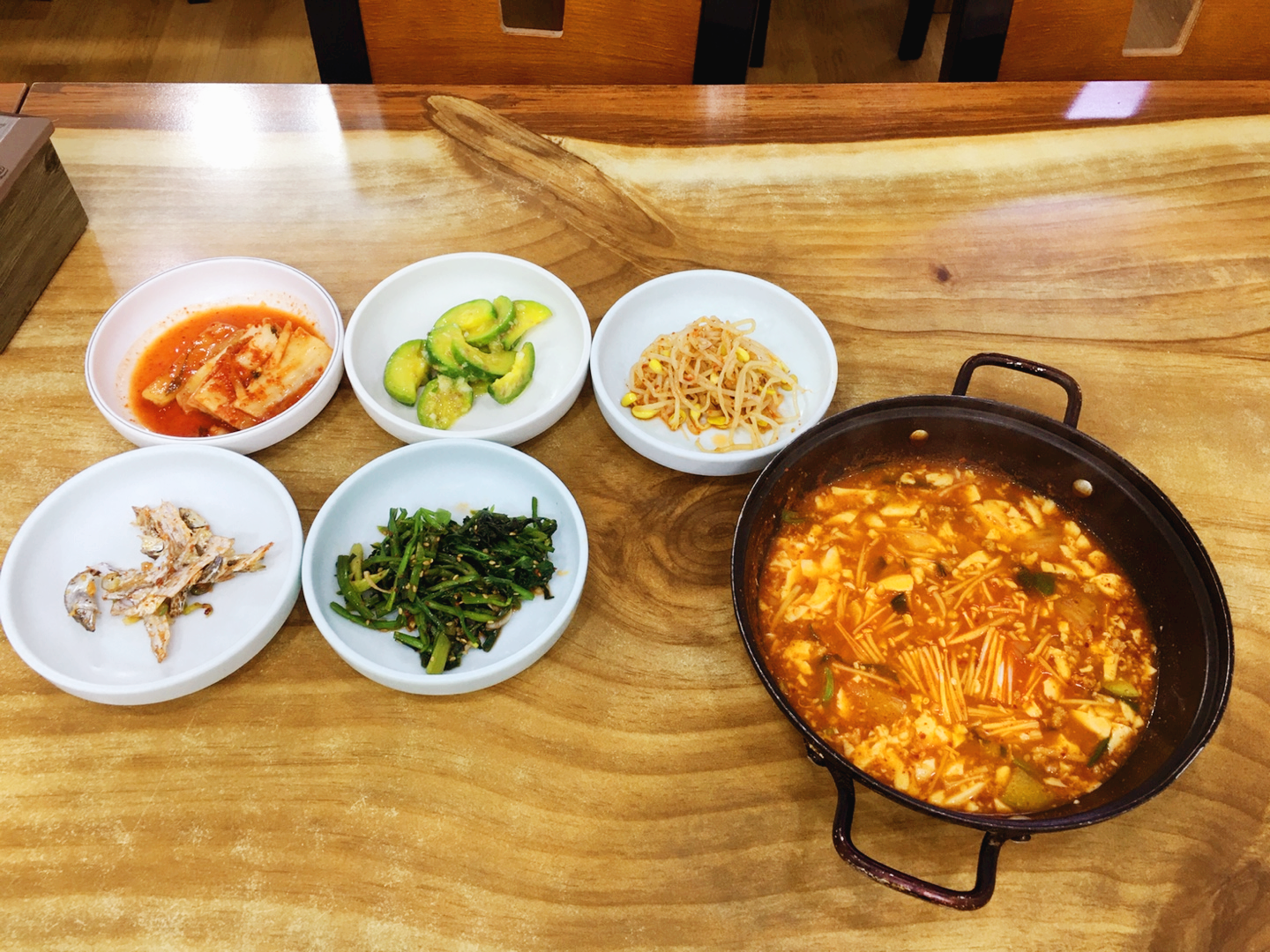 테이블에 뭔가 전골냄비처럼 보이는 넓고 깊이가 얕은 것에 순두부찌개가 담겨 나왔습니다.