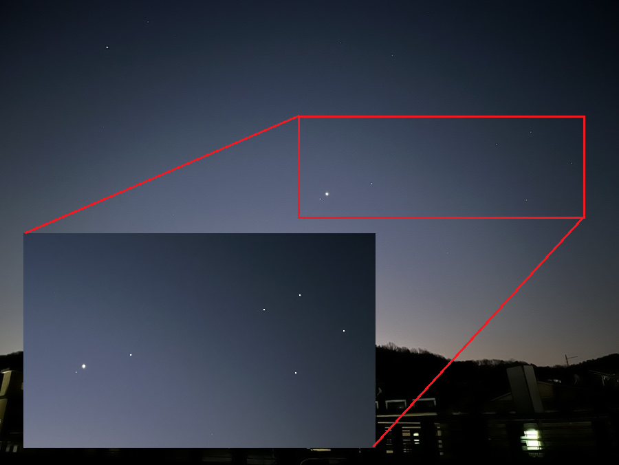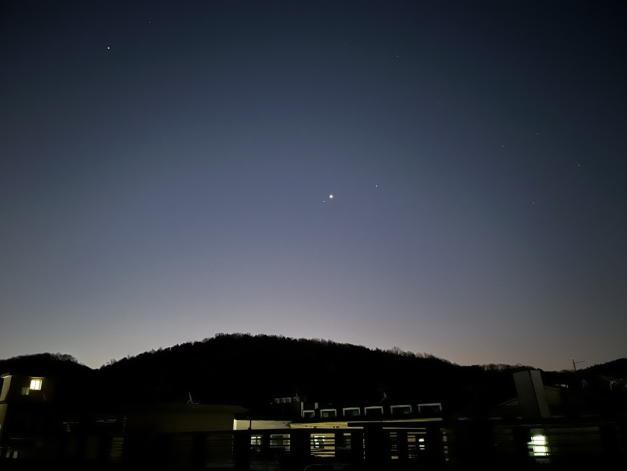 인터넷 뉴스를 보다가 뒤늦게 알게 된 사실이 바로 금성과 목성이 나란히 위치하는 모습을 관찰할 수 있다는 내용이었습니다. 성능이 조금 괜찮은 만원경으로 보면 목성의 위성도 함께 관찰이
