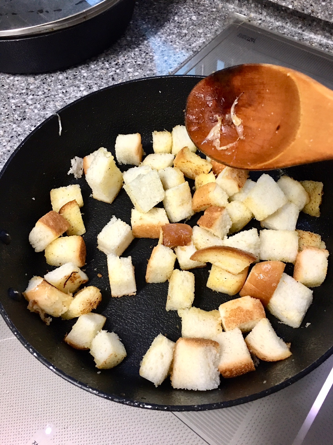 그래도 저 것만은 할 수 없죠? 집에 있는 식빵을 큐브 모양으로 자르고 버터를 두른 팬에 구워줍니다.