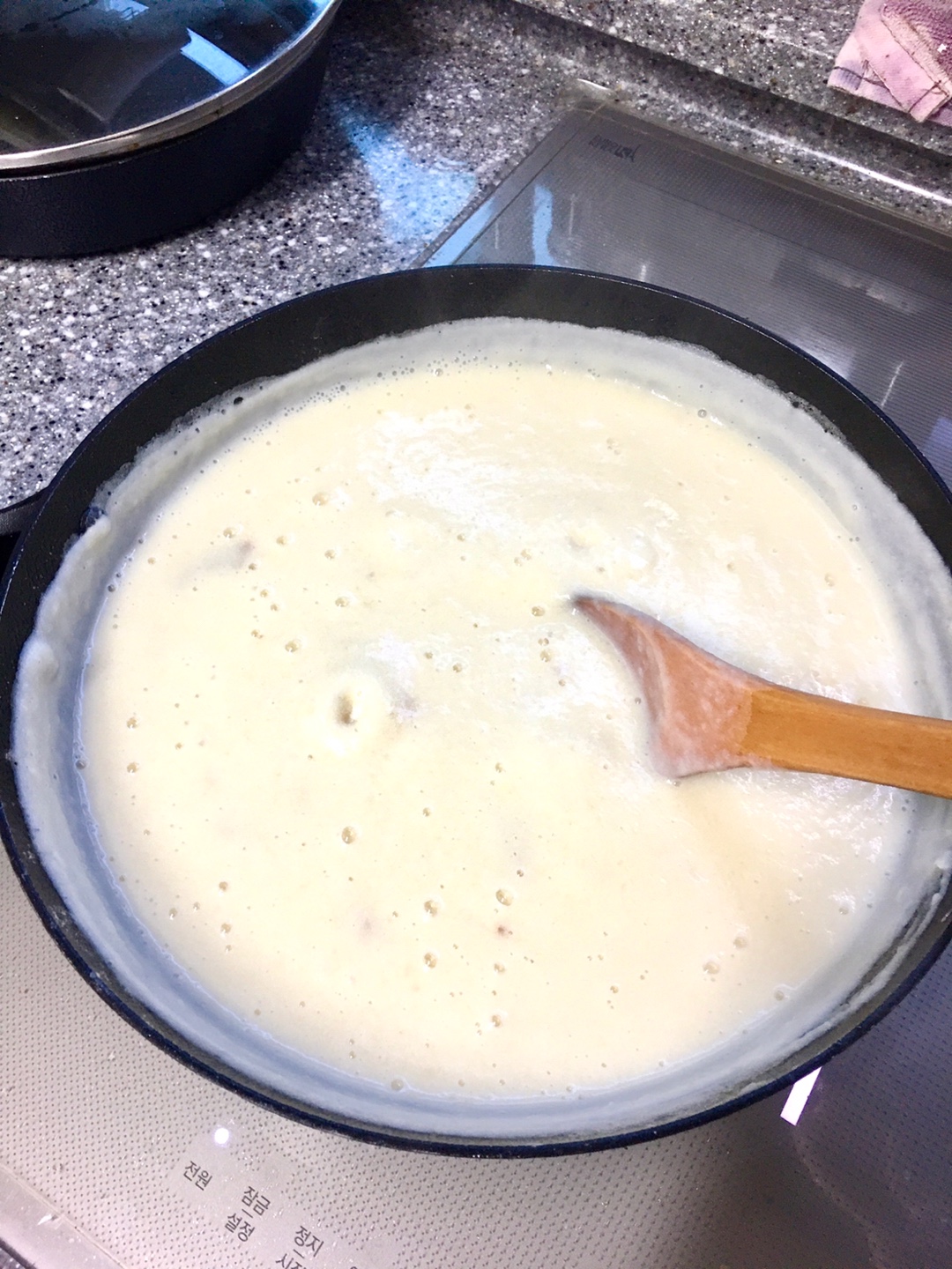 저렇게 눌어붙지 않게 계속 저어줘야 합니다.