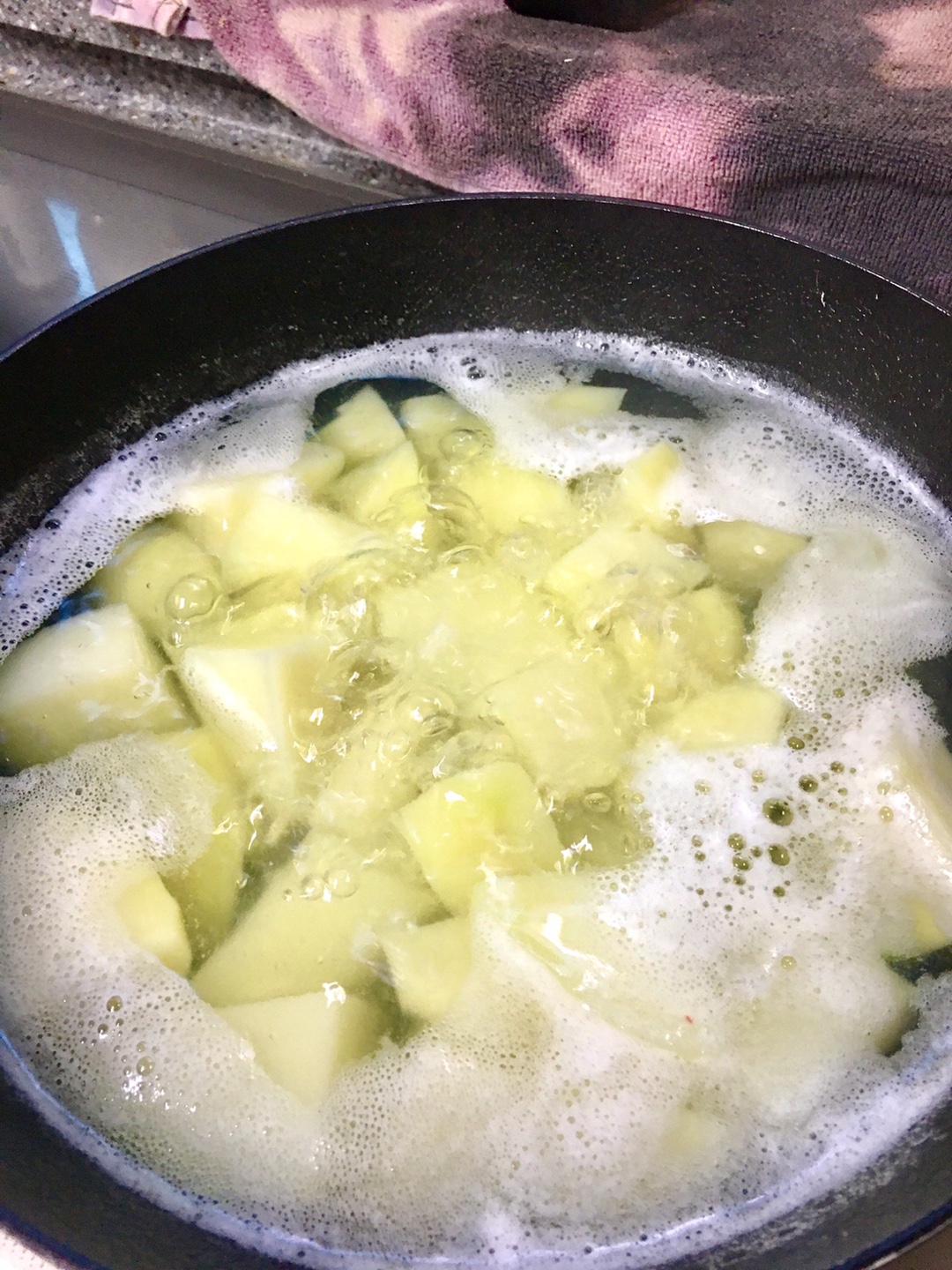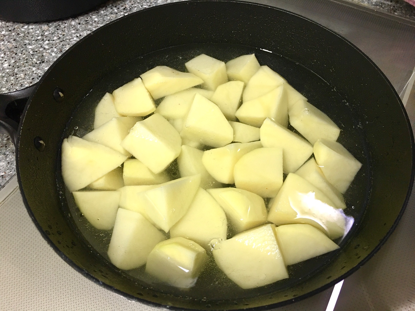 껍질을 제거한 감자를 빨리 잘 익을 수 있게 조각을 내었으며, 물도 많이 넣으면 끓는데 오래 걸리니 딱 잠길 정도만 해서 넣고 삶았습니다.