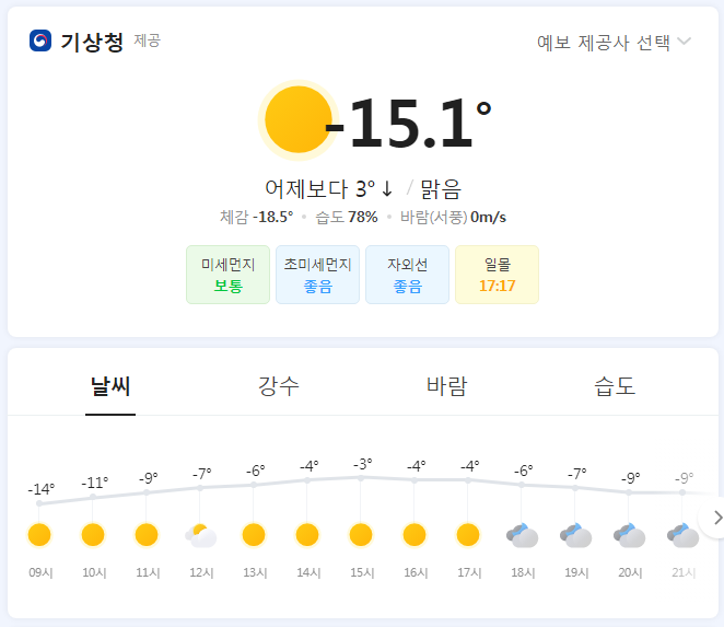 헛 그런데 기온만 봐서는 어제보다 춥네요, 그나마 조금 위안을 삼을 만한 것은 낮기온이 어제보다는 조금 높아서 그나마 다행입니다.