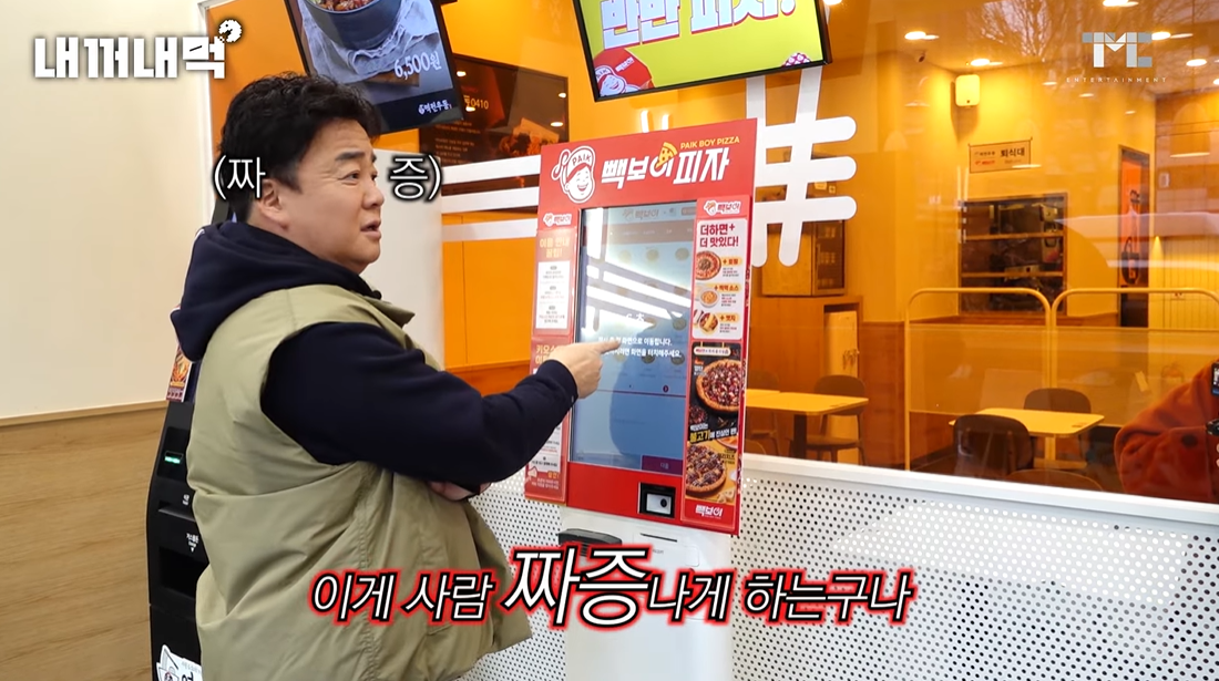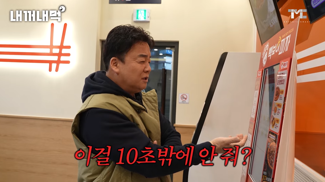 백종원 대표가 교대에 있는 자신의 프랜차이즈 빽보이피자를 방문하고 키오스크로 피자를 주문하다가 짜증을 냈습니다. ^^