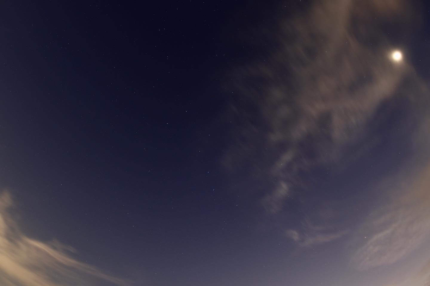 아직 컴컴한 밤하늘에 달만 해가 정오에 떠 있는 것처럼 같은 위치에 떠 있었고, 군대군대 구름이 빠르게 부는 바람에 의해 흘러가는 모습이 참 이쁘기 그지없었습니다.