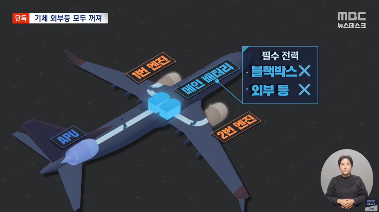 그리고, 비행기가 비행 중에는 절대 꺼서는 안 되는 외부등도 필수 전력 대상에 빠져 이번 사고영상을 보면 비행기의 외부등이 모드 꺼져 있는 것을 확인할 수 있습니다.