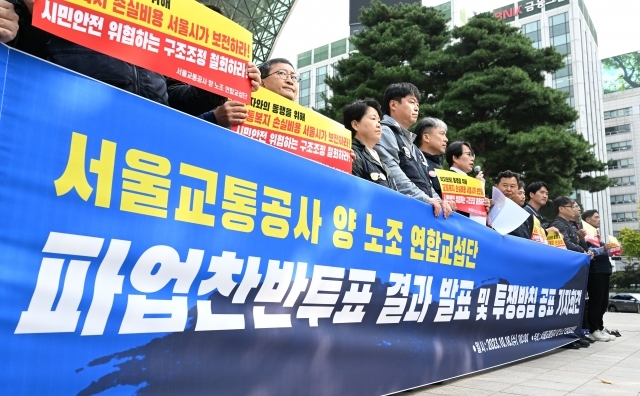 서울교통공사 노조 연합교섭단이 서울시청 앞에서 18일 파업 찬반 투표를 진행한 결과 73.4%로 파업에 찬성하여 오는 11월 9일부터 파업에 돌입하기로 하였습니다.