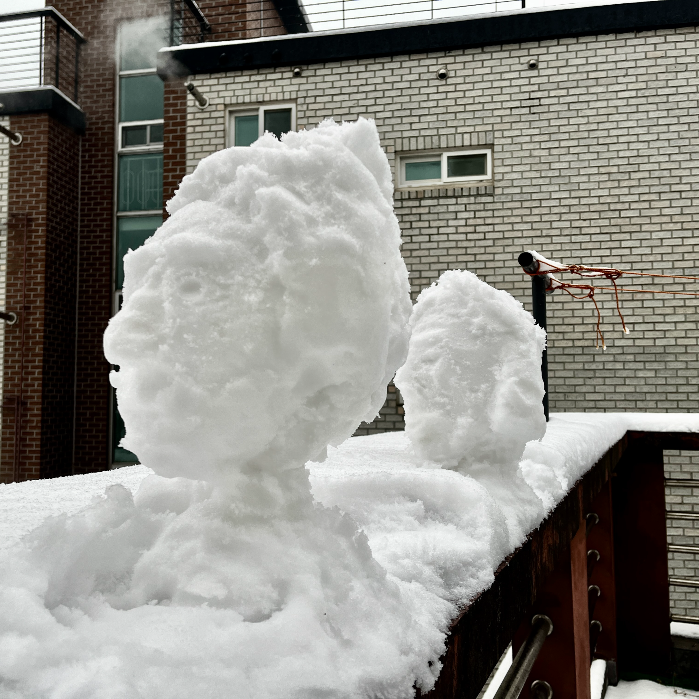 이렇게 두 개의 머리를 만들고 아들이 만든 몸에 머리를 두 개 올려보자 설득을 해봤지만, 아들의 강력한 반대로 인해서 실패 그럼 이 머리를 어디다 두어야 의미 있게 눈놀이를 정리할지 생각하다가, 정한 것은 바로 옥상 담장 위에 올리는 것이었습니다.