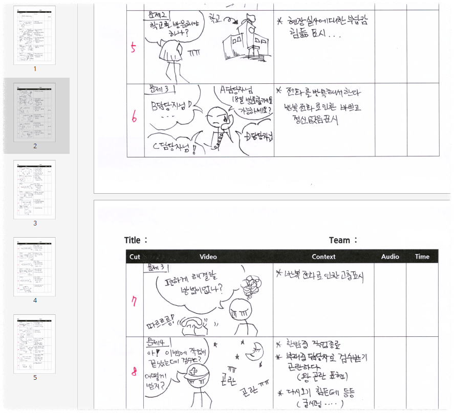 대충 다섯 장 분량의 스토리보드, 영상 제작 업체와 이야기해 보니 약 3분 정도의 영상이 나올 것 같다고 하더라고요, 그래서 저도 비슷한 생각이 있어 그렇게 하자고 하였습니다.
