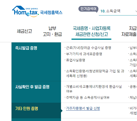 홈텍스에 로그인하시고 들어오시면 현재 화면 기준으로 상단 메뉴의 왼쪽에서 세 번째 메뉴 '국세증명ㆍ사업자등록 세금 관련 신청/신고' 메뉴를 보시면 기타 민원 증명이 있고요 거기에서 처음 표시되는 '거주자증명서 발급 신청'이라는 메뉴를 실행하세요