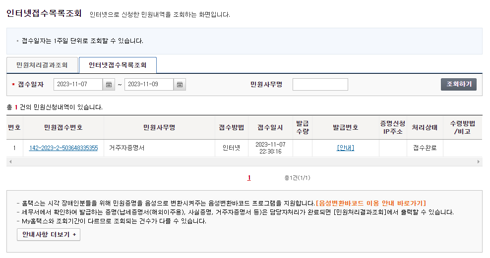 위 내용을 다시 홈텍스에 접근해서 보시려면 신청할 때와 동일하게 '국세증명ㆍ사업자등록 세금 관련 신청/신고' 메뉴의 하단 민원증명 조회/관리에서 '민원신청 처리결과 조회' 기능으로 확인할 수 있습니다.