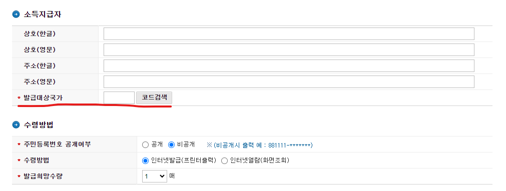 그것만 하시면 되는데 그것이 발급대상국가(코드:KR)와 발급된 서류를 수령하는 방법 이렇게 두 가지입니다.
