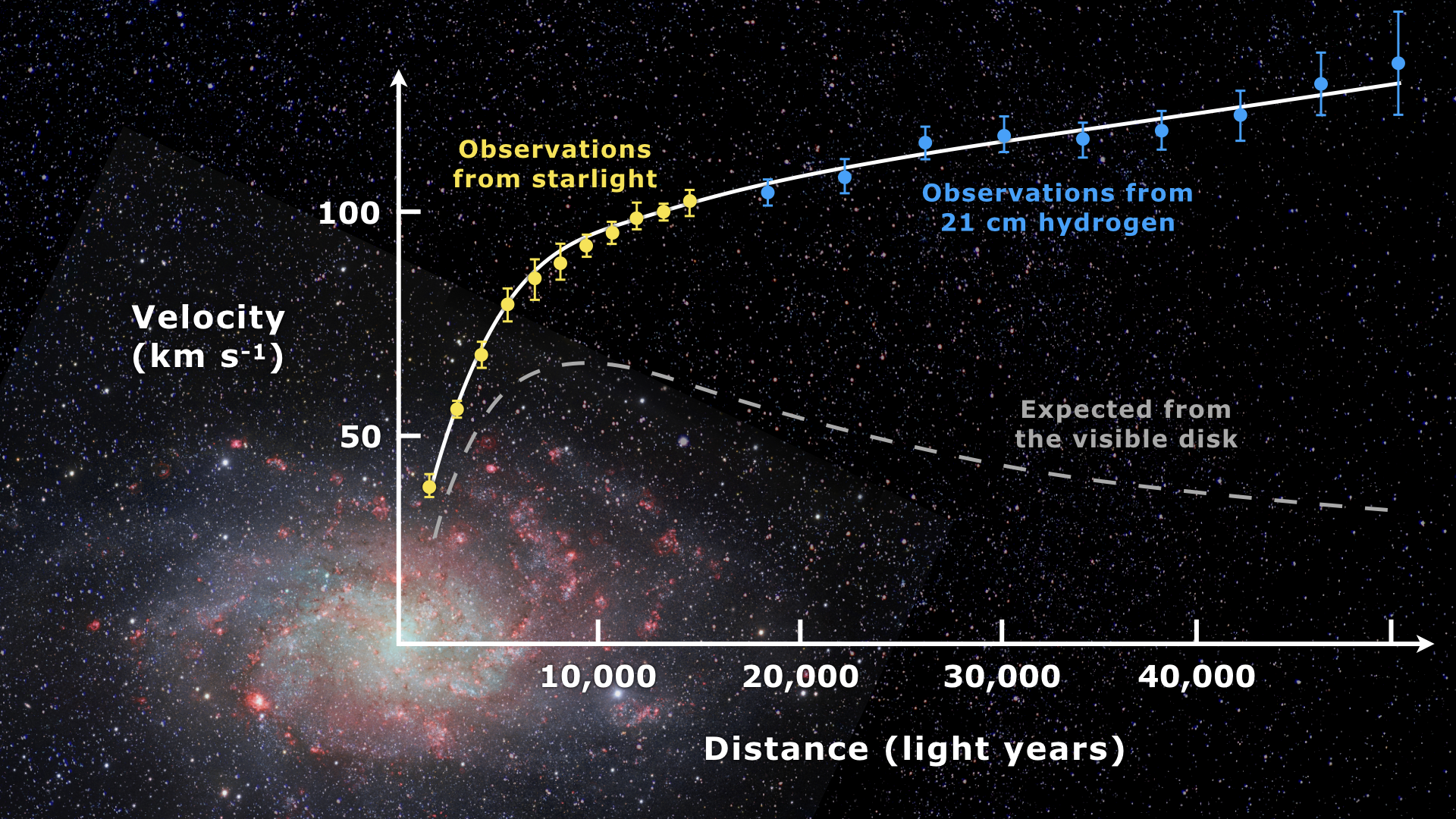루빈과 포드는 은하의 외곽 별들이 중심부 별들보다 훨씬 빠르게 회전한다는 사실을 관측했습니다.