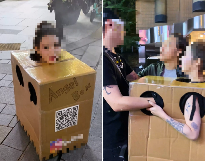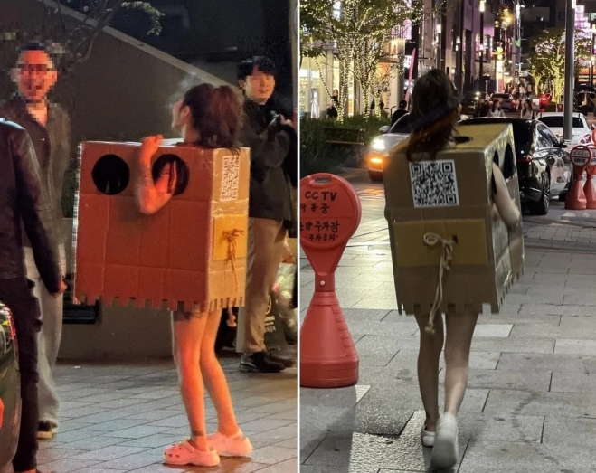 서울 한 복판에서 박스를 입고 나타난 여성이 박스 안으로 손을 넣어 자신의 가슴을 만지라고 하여 논란을 샀다고 합니다.