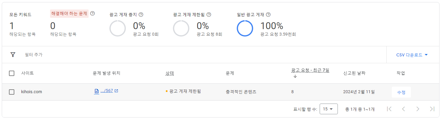 다행인 것은 '해결해야 하는 문제'가 없다는 것이고 광고는 계속 충격적인 콘텐츠로 광고게재가 제한되었다는 내용인데, 큰 문제가 아니라서 그냥 두기로 했습니다.