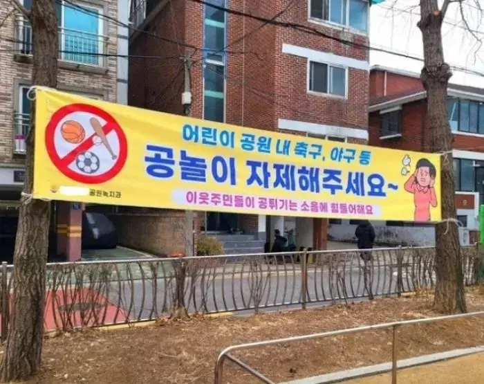 아이들이 신나게 뛰어놀아야 할 어린이 공원에서 공놀이를 자제해 달라는 문구가 적힌 현수막이 걸려 눈길을 끌고 있다.