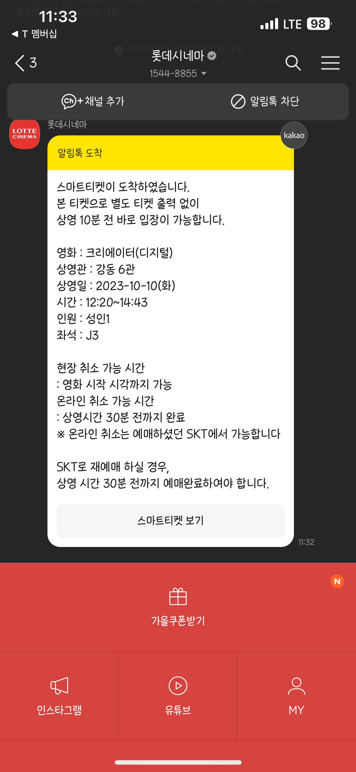 이유는 이 롯데시네마가 제 이동 반경에 전혀 없다는 것과, SK통신사 멤버십 혜택에 월 1회 공짜 영화를 볼 수 있게 해주는 것이 있는데, 그렇게 오래 SKT를 사용했지만 한 번도 사용해 본 적이 없었던 혜택을 누려보자라는 마음이 강해지며 동네 마실은 다음 기회로 넘겼습니다. ^^