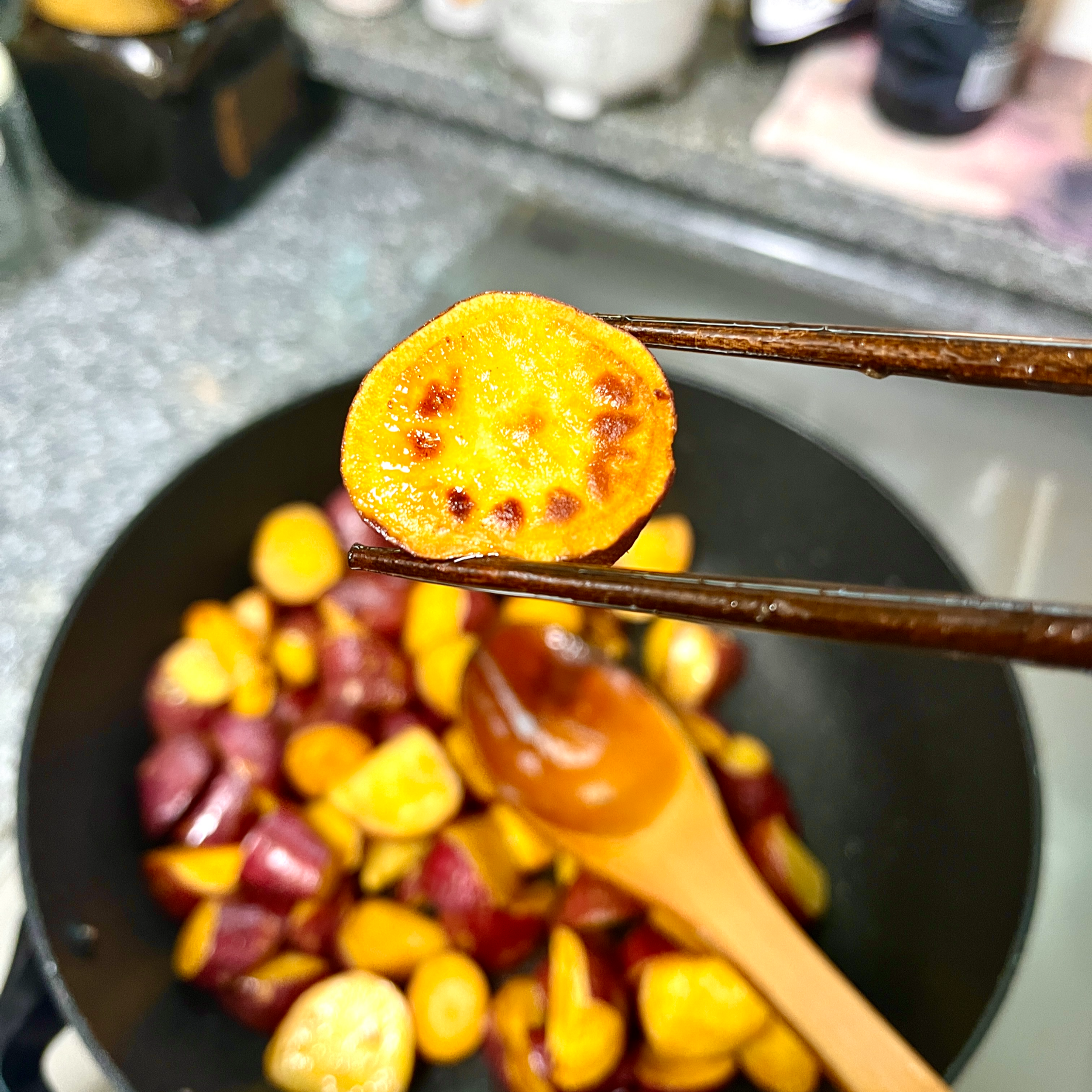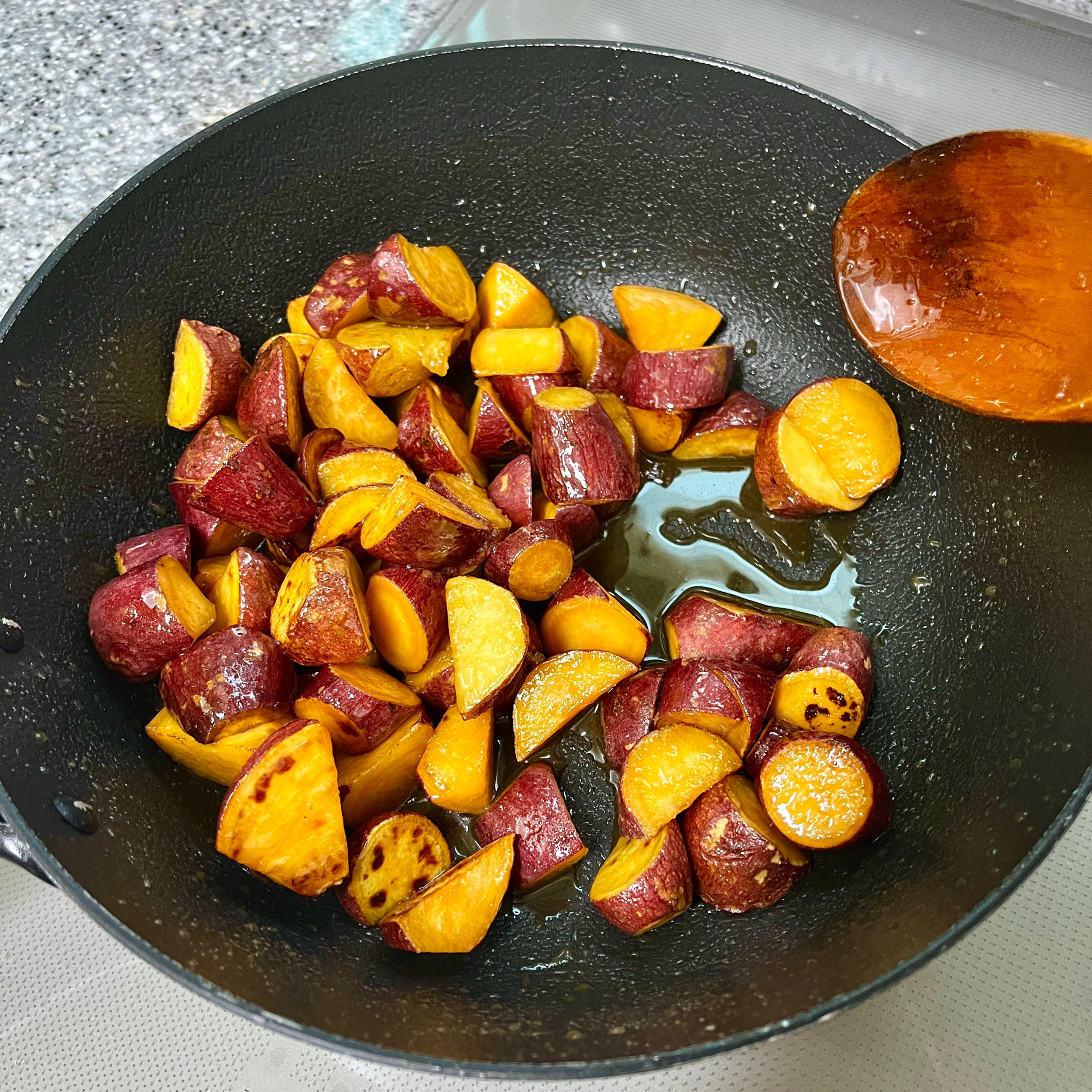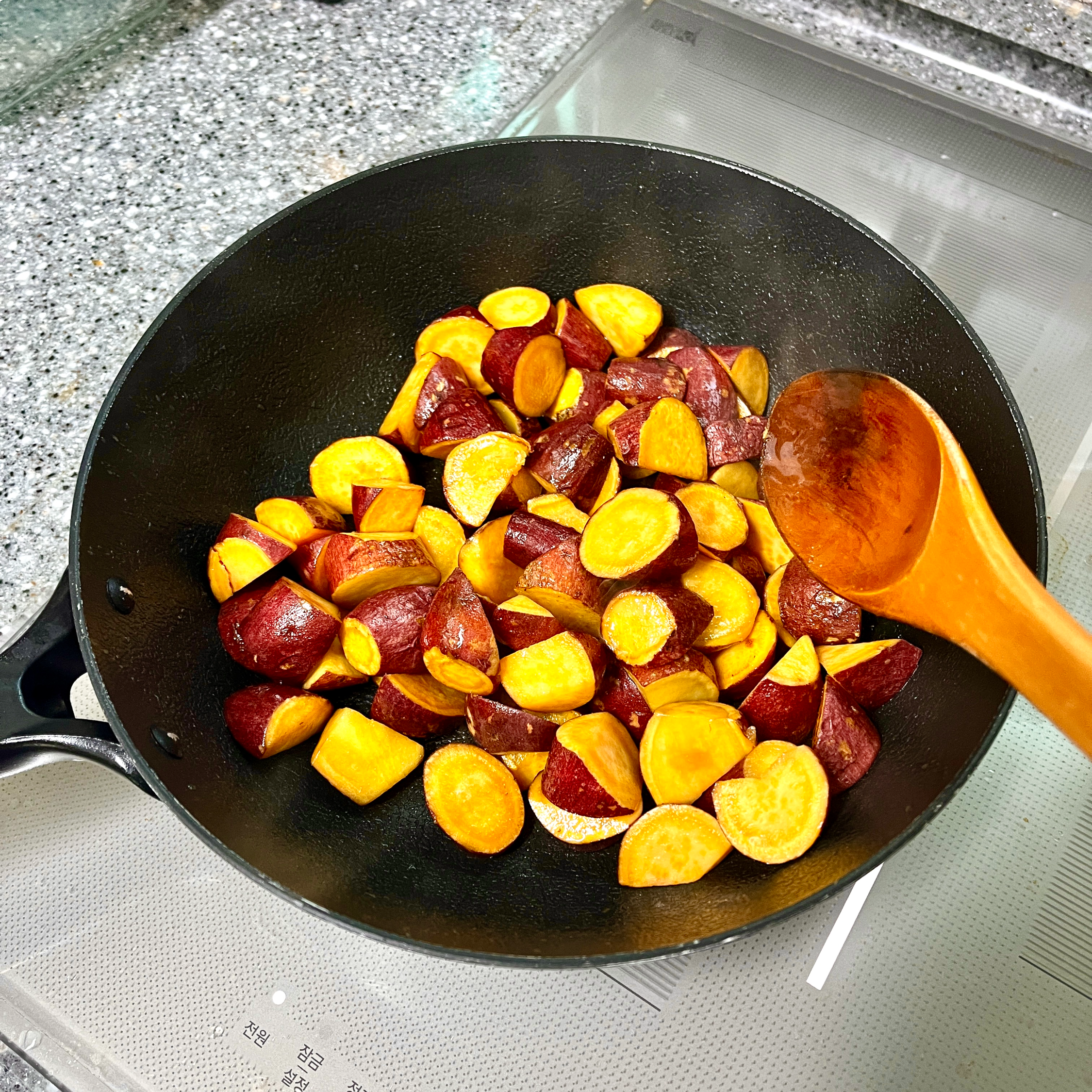 - 기름을 두른 팬에 잘 익은 고구마를 넣고 구워준다