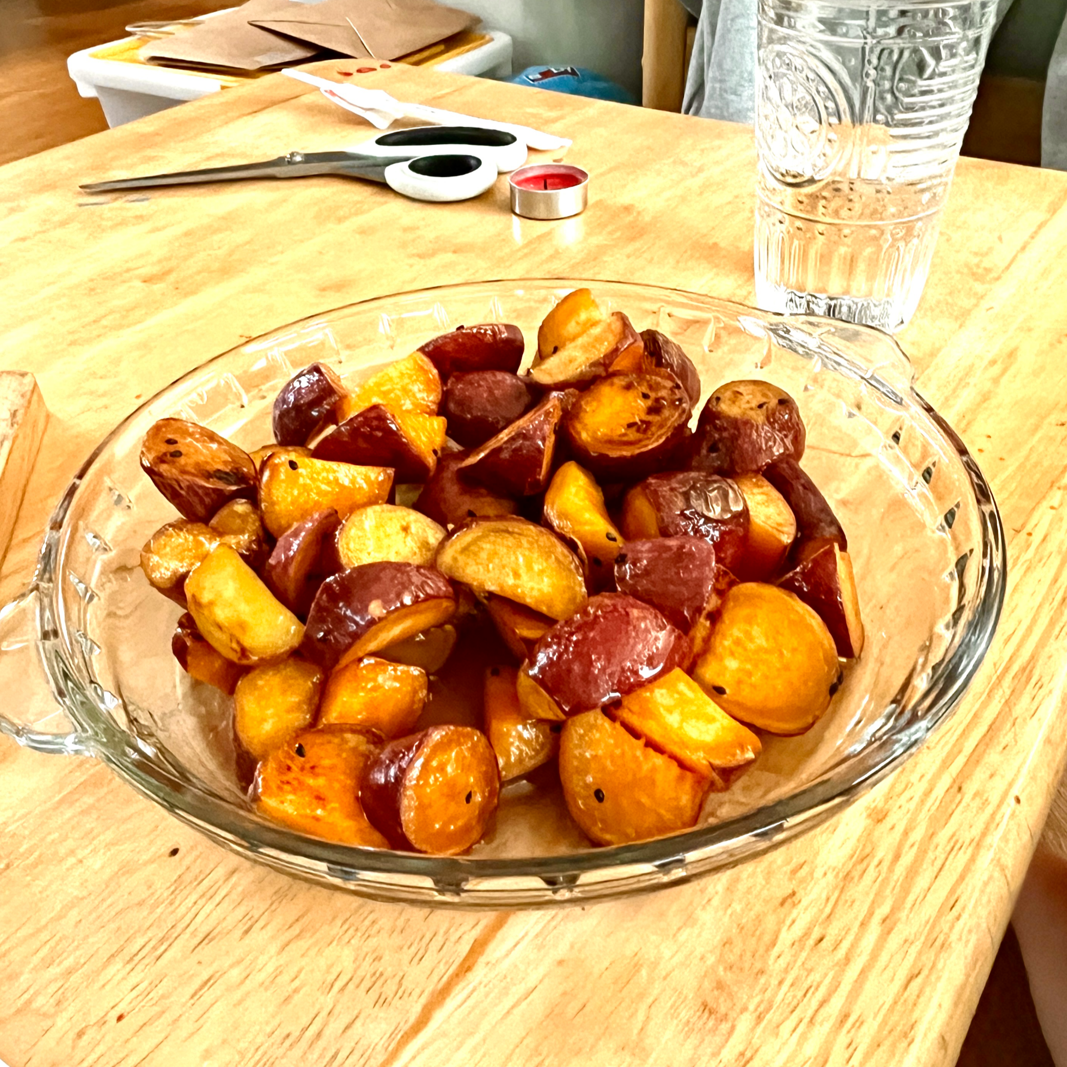 사실 물엿을 한번 끓여야 하는데요, 그렇게 하고 고구마를 섞었으면 맛탕이 식고 나서는 좀 더 물엿이 사탕 같은 식감이 되는데요 저는 그냥 바로 섞었어요 ^^, 그래도 달콤하고 좋아요 ^^