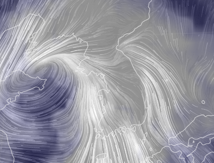 구름 지도를 보니 다행히 전국을 비구름이 감싸고 있는 모습이네요, 그리고 서쪽 중국 산동반도를 중심으로 바람이 휘몰아치고 있어 아주 바람이 강할 것으로 보입니다.