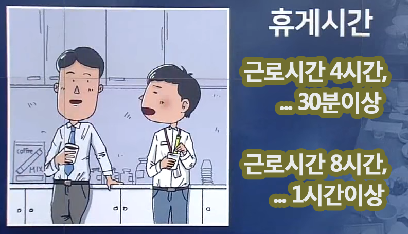 휴게시간은 4시간에서 7시간 59분까지 근무에 대해서 30분 이상을, 근로시간이 8시간을 채우면 1시간 이상을 주며, 8시간 이후의 근로 시간은 4시간 단위로 30분씩 추가로 발생하도록 되어 있습니다.