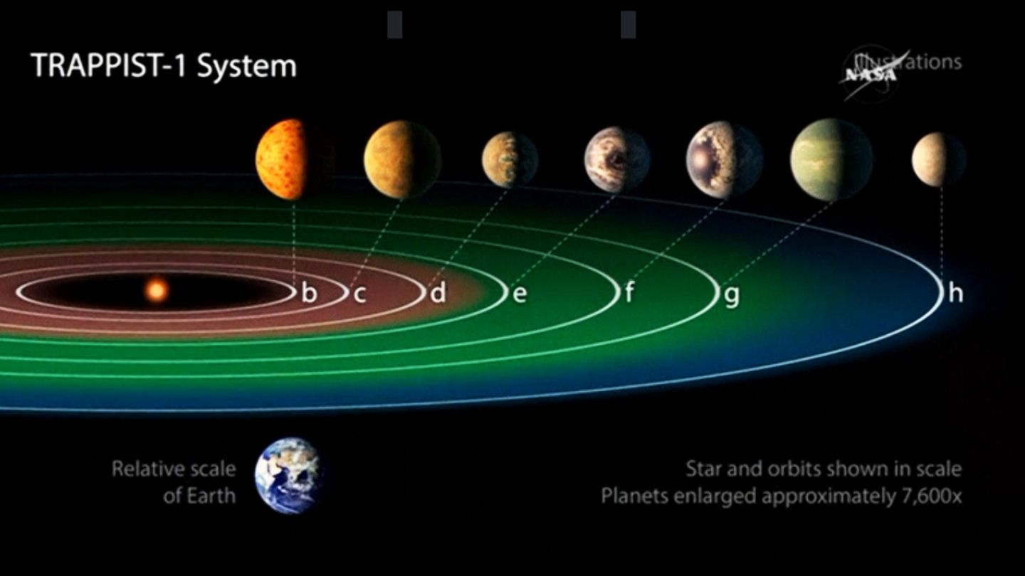 트라피스트-1 행성계는 초저온 왜성인 트라피스트-1 주변을 공전하는 7개의 지구 크기 행성으로 구성되어 있습니다.