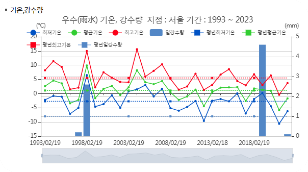 기상청 홈피에서 최근 30년간 우수의 날씨를 확인 할 수 있는데 대략 7에서 8년 단위로 추웠다가 따뜻했다가를 반복하고 있는 것으로 보입니다.