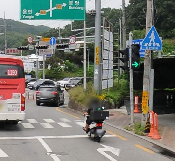 해당 도로는 사진에서 보시는 것처럼 모든 노선버스가 직진으로 주행을 하기에 횡단보도 신호가 파란불이 켜지면 당연히 우회전 신호는 빨간불이 들어오는데 버스가 정차한 경우가 많아 횡단보도를 걷는 사람을 발견 못하여 신현리에서 분당 율동공원 방향으로 우회전하는 차량이 무정차 통과, 더구나 이 횡단보도가 평소에 사람이 적다 보니 무정차 통과를 탈력 받고 달리려는 운전자로 인명사고가 많이 발생하여 우회전 신호가 생겼다는 후문을 들어었습니다.