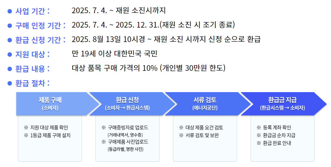 7월 4일부터 시작된 이 사업은 구매한 1등급 전자제품의 구매 금액 중 10%를 환급해 주는 사업으로 재원이 소진되면 더 신청을 받지 않으니, 이 기회에 가전제품 구매할 일이 있으시면? 구매하시고 환급받으세요.