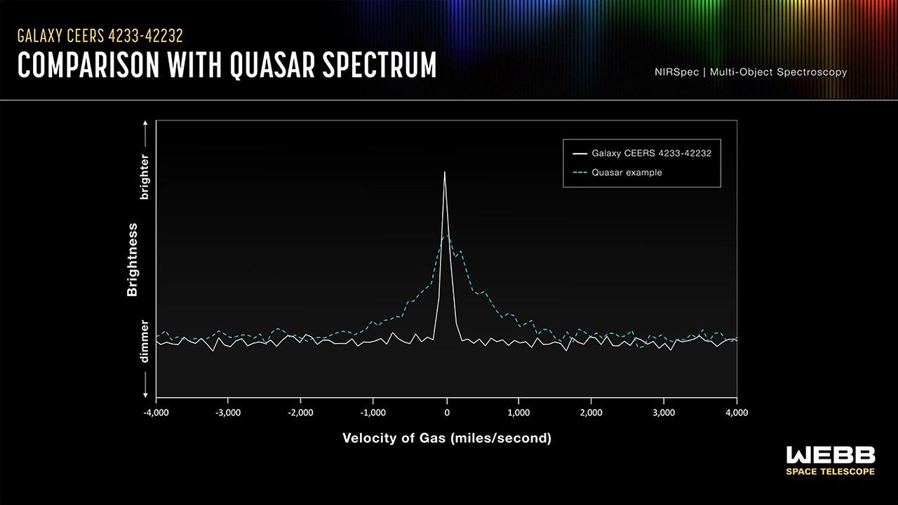형태학적으로 완벽한 점광원이라면 퀘이사(초대질량 블랙홀 중심의 활성 은하핵)일 확률이 높지만, 분광 스펙트럼(Spectroscopy) 분석 결과는 이 예측을 완전히 빗나갔습니다. 퀘이사의 강력한 중력장 속에서 초고속으로 회전하는 가스가 만들어내는 '넓게 뭉개진 방출선(Broad emission lines)'은 전혀 관측되지 않았고, 오히려 대규모 항성 생성 영역에서 느리게 움직이는 가스가 발산할 때 나타나는 '좁고 뾰족한 방출선(Narrow permitted emission lines)'만이 뚜렷하게 포착된 것입니다.