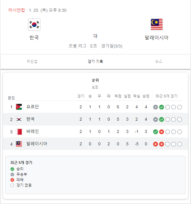 한국의 마지막 경기도 오는 25일 오후 8시 30분에 말레이시아와 예정되어 있습니다.