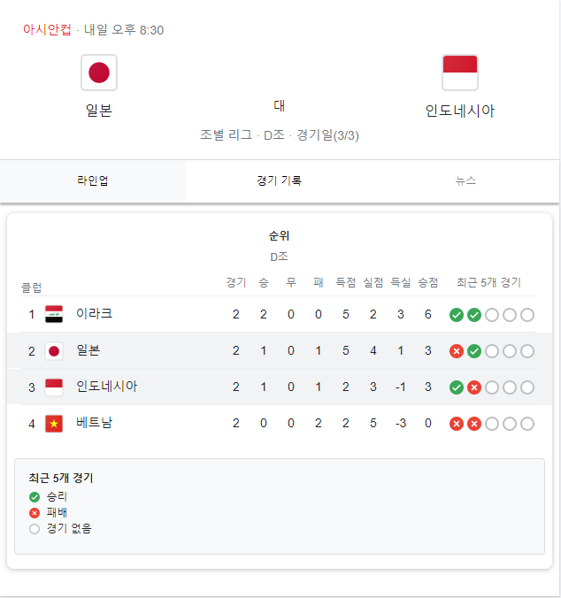 인도네시아와 일본은 아시안컵 예선 D조에서 만나 현재 3위와 2위에 골득실차(2골)로 순위가 결정되어 있습니다.