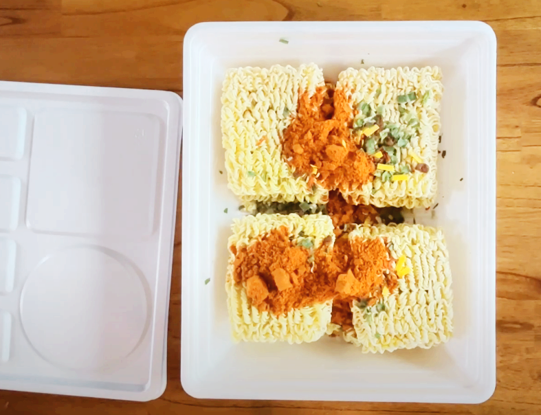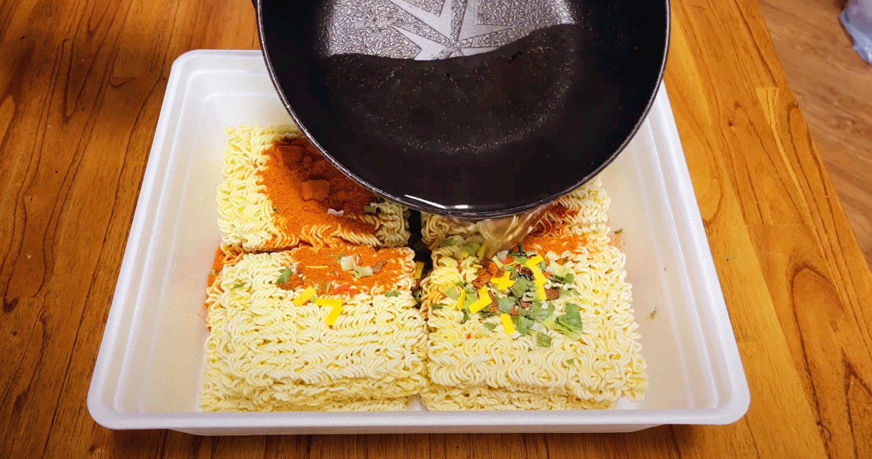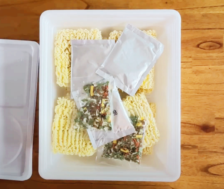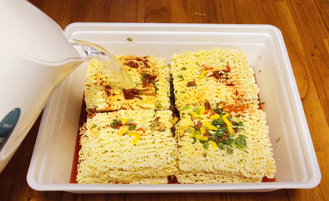 도시락에 후레이크 스프와 분말스프를 다 넣고, 뜨거운 물 2.2리터를 조심히 넣어줍니다.